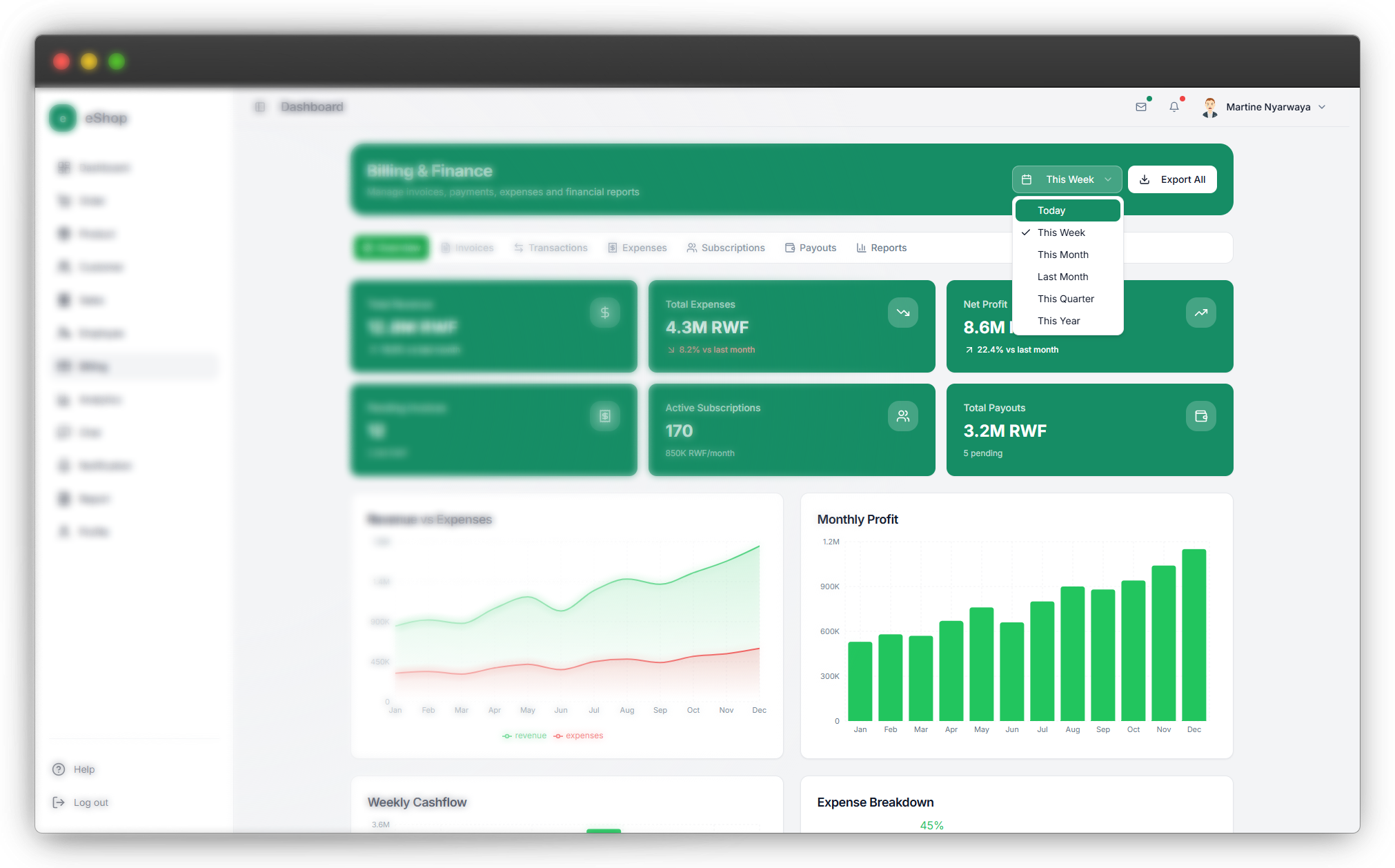 Record transactions, generate professional invoices, track payment statuses, and monitor revenue, expenses, and profit — with a complete billing suite including subscriptions and payouts.